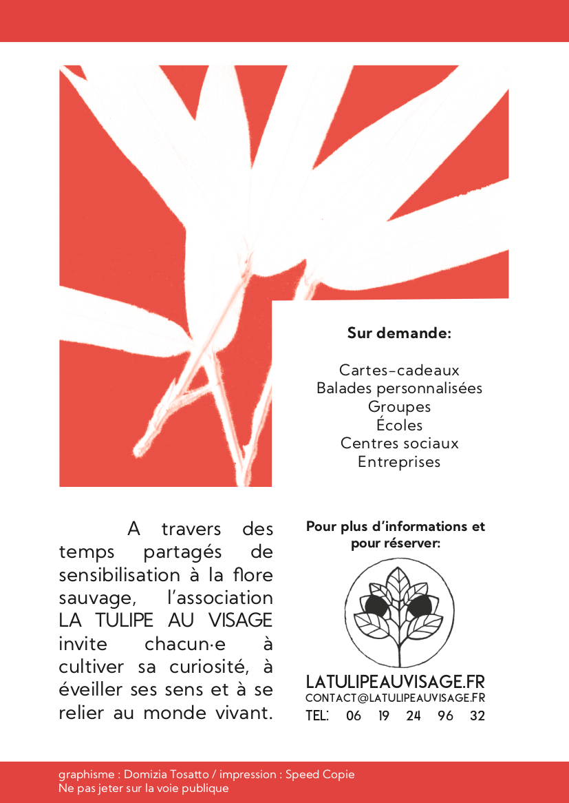 À travers des temps partagés de sensibilisation à la flore sauvage, l’association LA TULIPE AU VISAGE invite chacun·e à cultiver sa curiosité, à éveiller ses sens et à se relier au monde vivant.