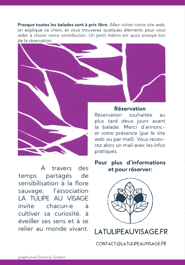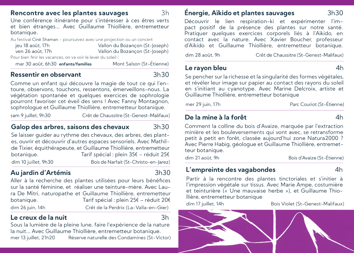 Et bien sûr, les comparses avec qui on aime déjà vous emmener à la rencontre des plantes sauvages : la pleine lune, l’Aïkido, le cyanotype, l’impression végétale, les chevaux et le festival CinéShaman.