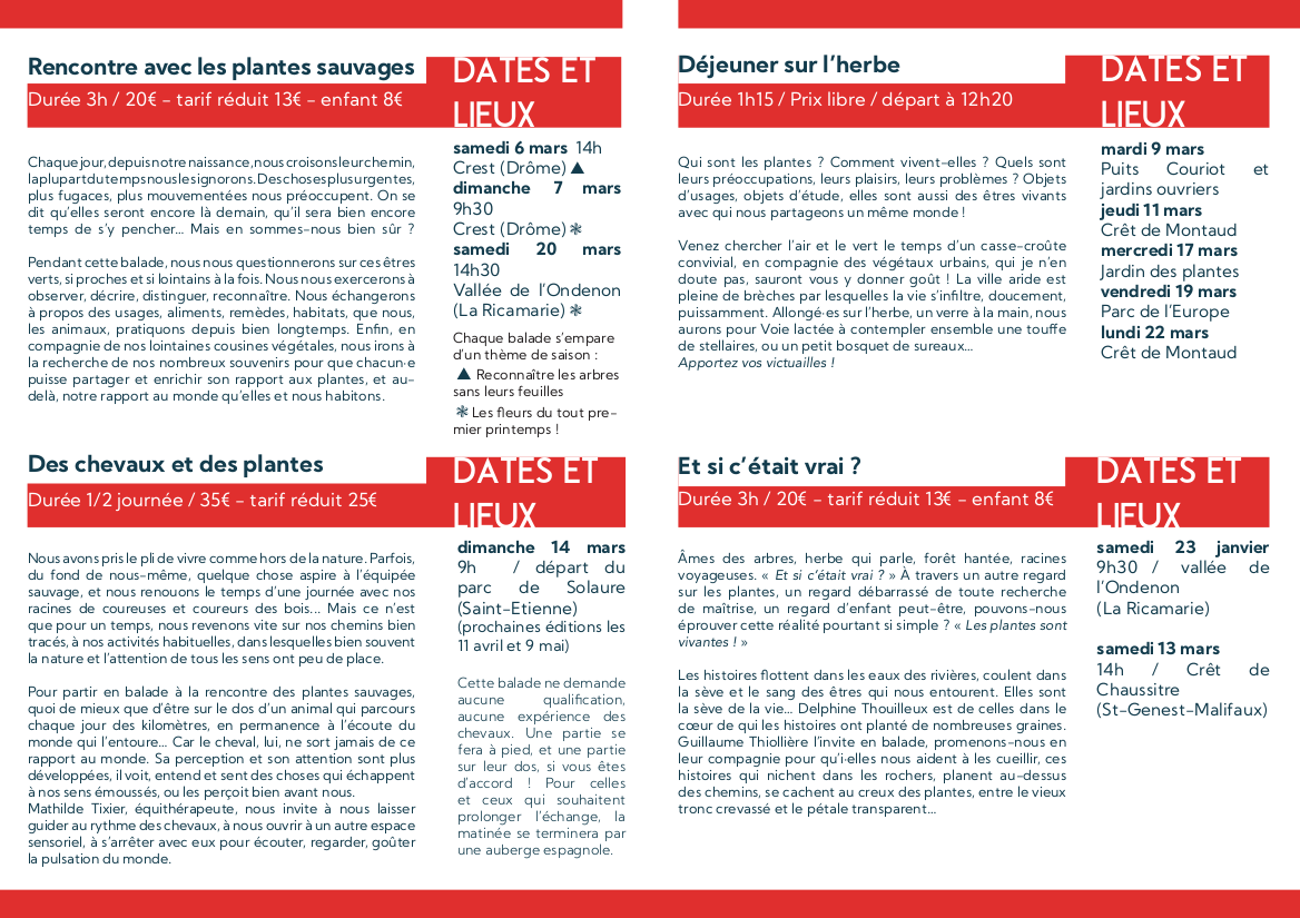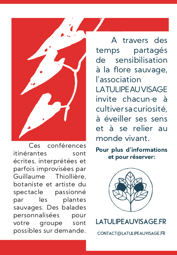 Après une semaine de repérages et de rencontres dans la vallée de la Drôme, La tulipe au visage revient autour de St Étienne pour un mois de mars bien rempli : vous trouverez un petit rappel du programme des balades de mars ci-dessous.